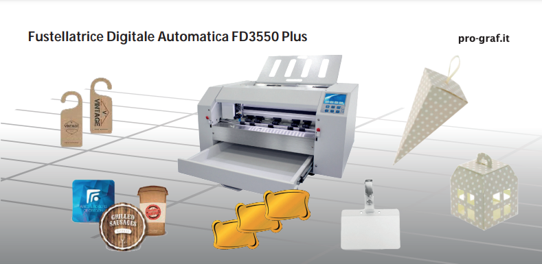 La Fustellatrice Digitale Prograf FD 3550AVF rappresenta l’unica Fustellatrice del Segmento Entry Level interamente automatizzata che Taglia e Cordona contemporaneamente grazie alla Testa con Doppio Utensile ed al Mettifoglio ad Aspirazione.
