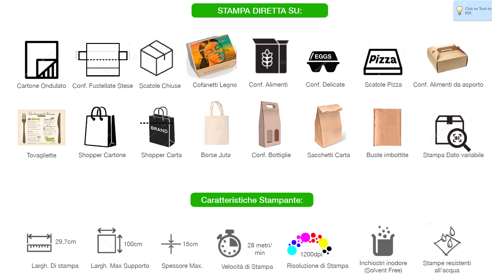 Questa stampante digitale per stampa diretta CMYK Single Pass è tra le più performanti sul mercato, ideale per la stampa diretta di piccole e medie tirature di scatole di cartone, sacchetti di carta, scatole pizza, legno, polistirolo, tovagliette di carta, polpa di cellulosa, cotone e juta.